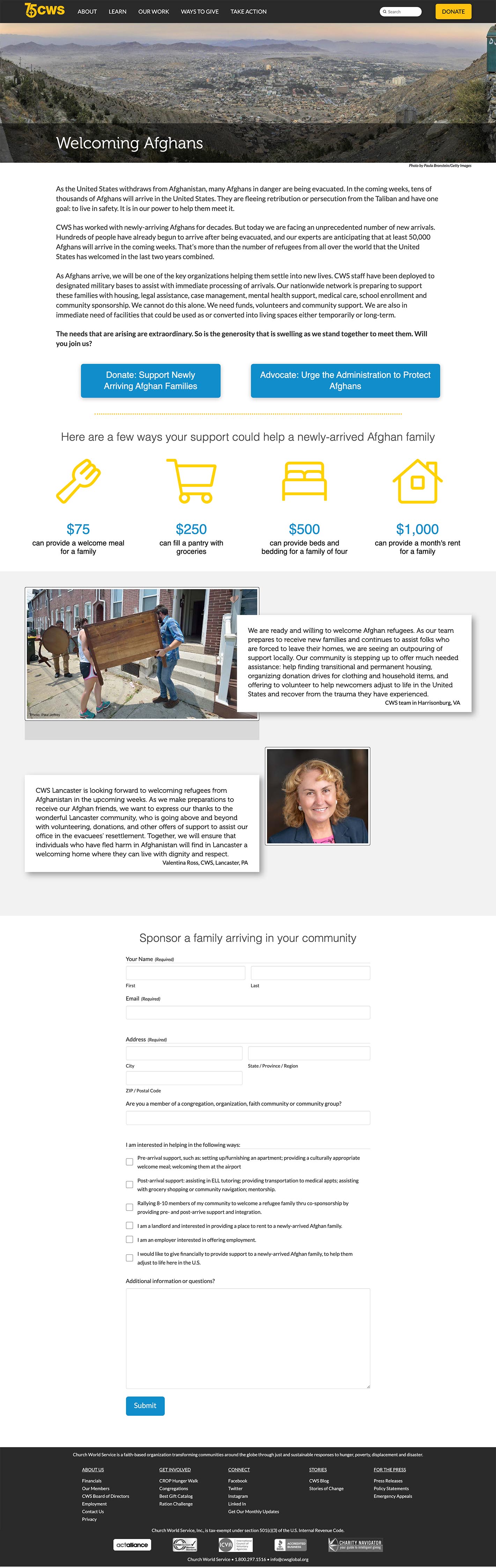 This “Take Action” page is exemplary in terms of providing plenty of information, stories and general context to support their request for help. Welcoming statements from a couple of the communities in which the organization resettles Afghan refugees precede the simple form. In fact, there’s a pervasive tone of warmth and welcome throughout the page. There’s also a link to the Charity Navigator in the footer so you can check out their high trust rating.